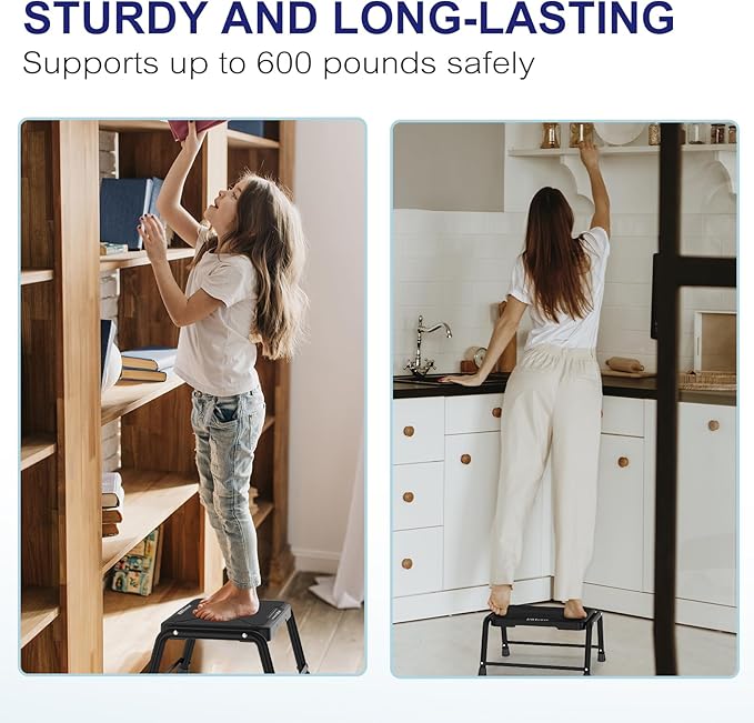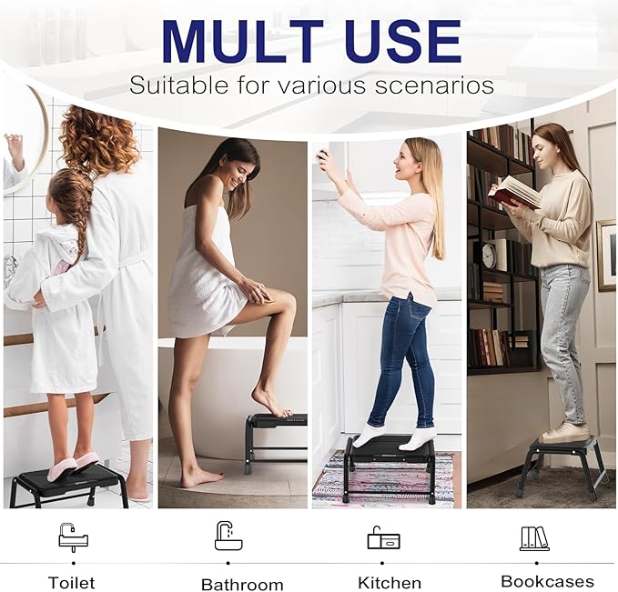 - VERSATILE FUNCTIONALITY: From reaching high cabinets to changing lightbulbs,the metal step stool is a versatile companion for everyday tasks,it's also an excellent gift for your families. Whether it's used as a kitchen stool, bathroom stool, bedside step, or closet assistant, it caters to the needs of adults, and seniors alike