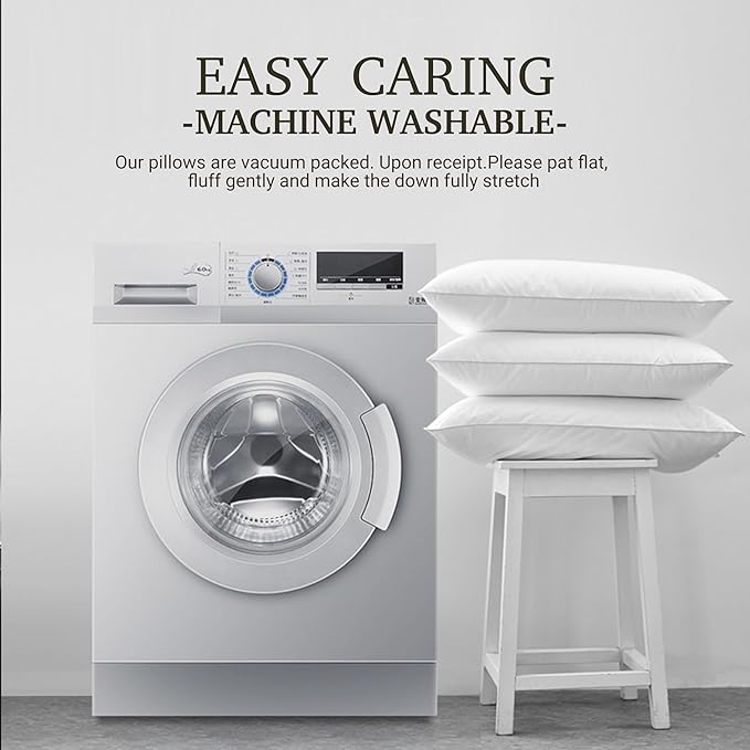 - [EASY CARING] Our pillows are vacuum packed. Upon receipt.Please pat flat, fluff gently and make the down fully stretch; Machine wash allowed.