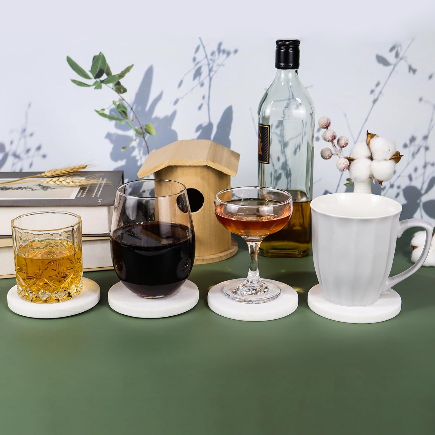 Pure White Marble Coasters Without Particles, Set of 4 - Natural Marble Stone Drink Coaster with Protective Silicone Feet, 4 inch Diameter, 0.4 inch Thick - Heat-Resistant Coasters for Coffee Table