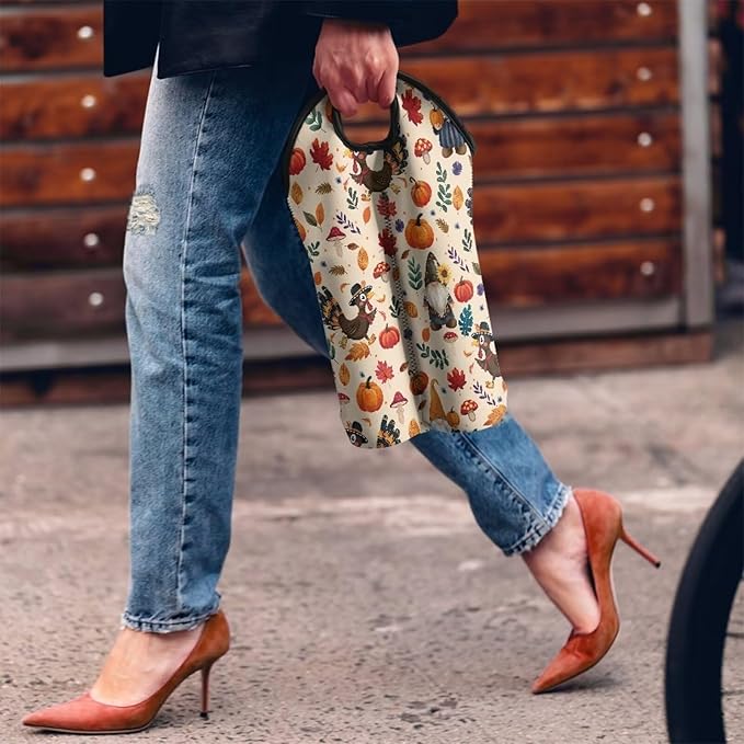 doginthehole Thanksgiving Gnomes Wine Bottle Tote, 750ml 2 Bottles Hand-Held Neoprene Wine Bottle Bag Hand Bag for Travel with Carry Handle, Fall Pumpkin Turkey Champagne Bottles Carrying Case