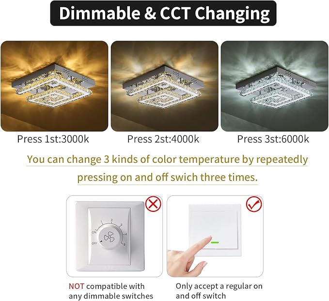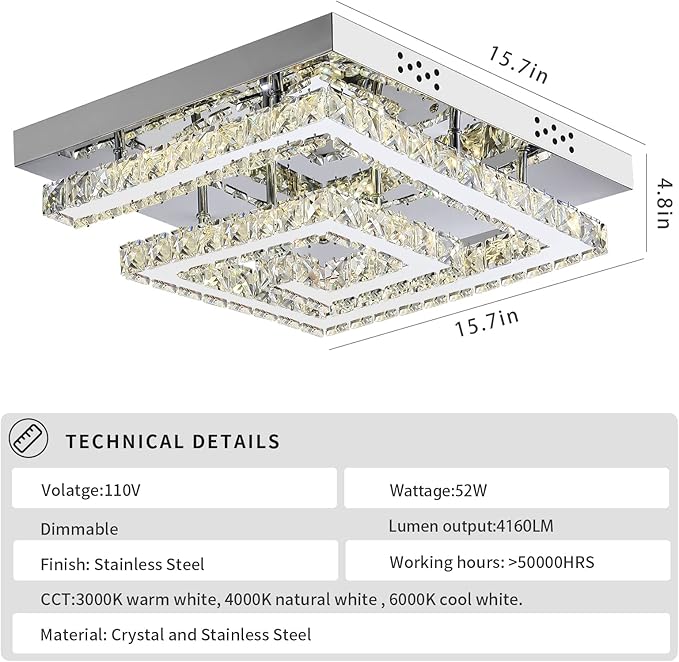 - 【DIMENSION】The overall size of the crystal flush mount lights is 16" x 16" x 4.8"H, Crystal Chandeliers height: 4.8", 2 Layers Led light source crystal light, Wattage: 33 W*3.