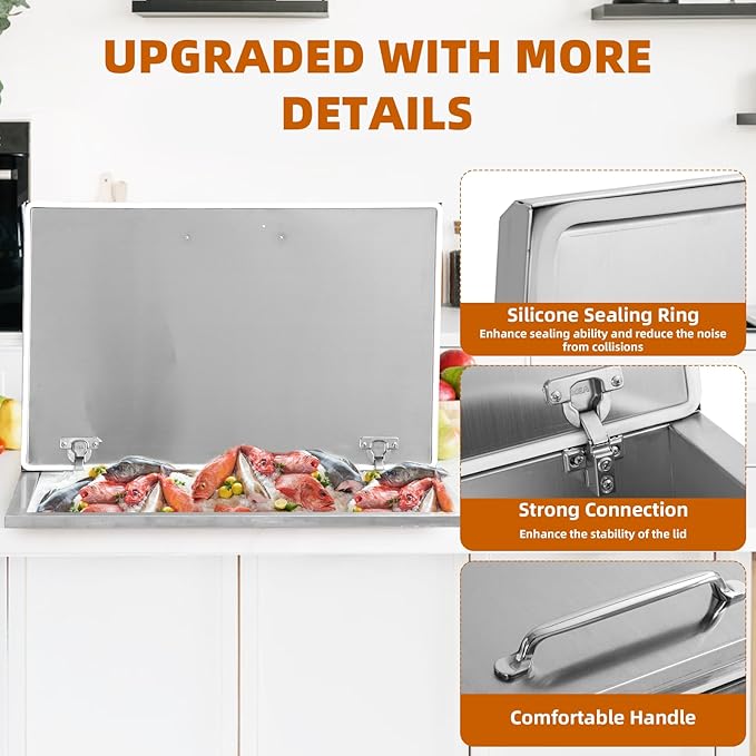 Upgraded Drop in Ice Chest, Stainless Steel Ice Cooler, Commercial Ice Bin with Cover, Outdoor Kitchen Ice Bar, Drain-Pipe and Drain Plug Included, for Cold Wine Beer