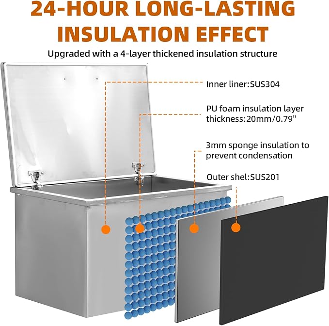 - Stainless Steel Construction: Made from high-quality food-grade 304 stainless steel, this ice chest is durable and easy to clean. The double-layer design and high-density insulating rubber interior keep your ice cool for extended periods.