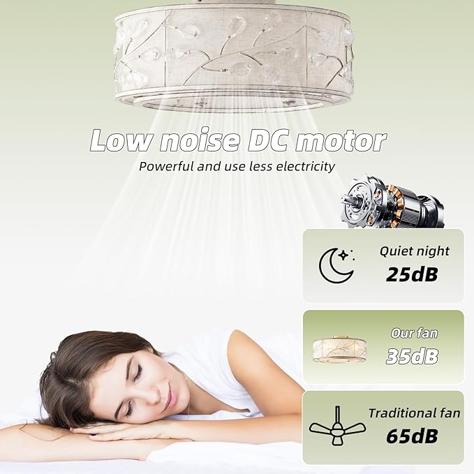 - Timing function, Intelligent control: We believe in understanding your life rhythm, so the white crystal ceiling fan with is also equipped with a timing function (1/2/4 hours). You can set the timer switch of the fan and light so that they work automatically when you need them. For example, the fan will automatically turn on in the afternoon of summer and easily turn off at night, providing you with a convenient and comfortable use experience.