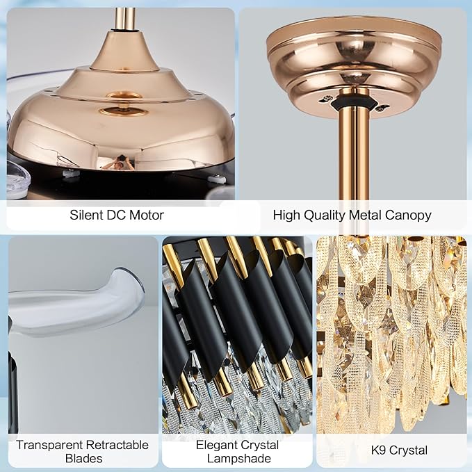 - ⭐【Retractable & Invisible Blades】The fan blade of this black gold ceiling fan light is retractable. The fan blade can be open and closed through the remote control. The material of the fan blade is ABS, the surface is smooth and delicate, and it is easier to clean.