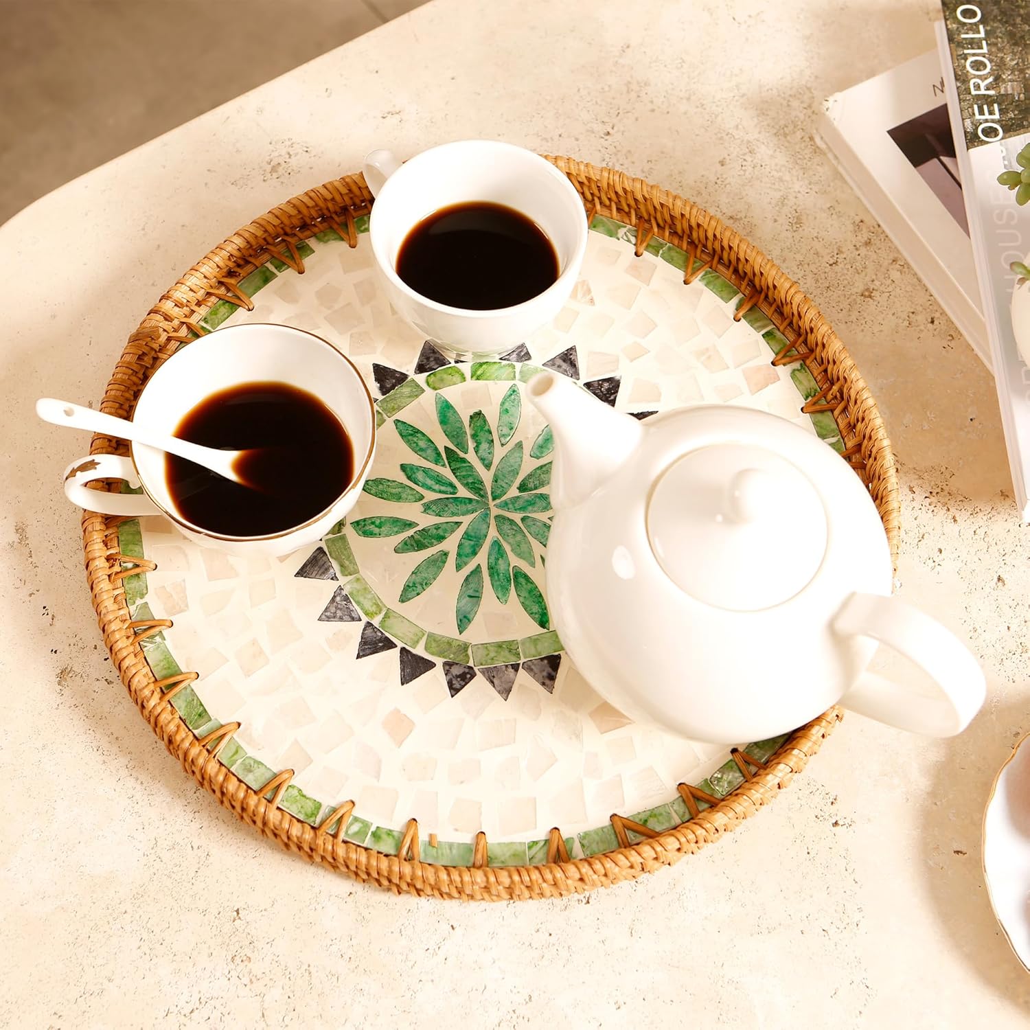 - Handwoven with Care: Each tray is carefully woven by skilled artisans, natural rattan texture and the subtle shine of seashells, reflecting a high level of craftsmanship and attention to detail