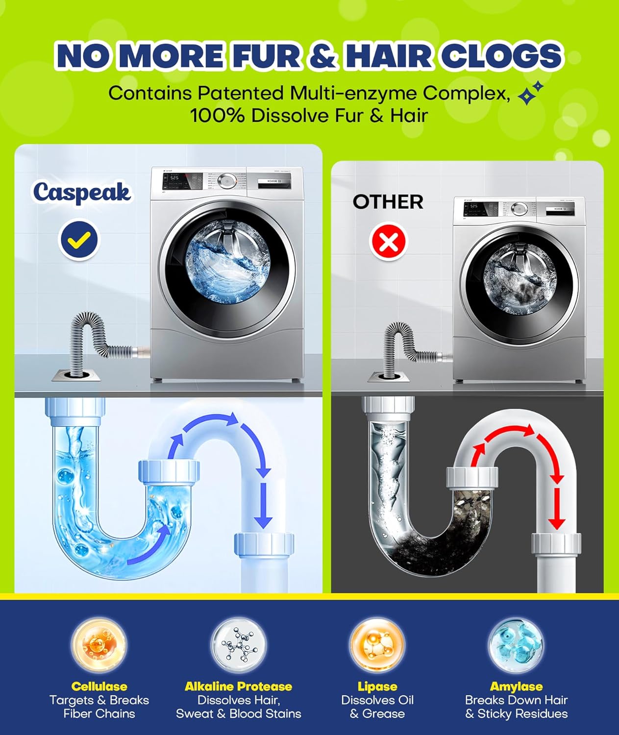 - PESKY FUR? LET OUR ENZYME FORMULA HANDLE IT - Caspeak pet hair dissolver for washing machine contains patented multi-enzyme complex. It targets fiber chains in pet and human hair, breaking them down and 100% dissolving them. Specially made for pet families, Caspeak laundry cleaner dissolves quickly and leaves no chemical residues behind â safe for both pets and humans. Say goodbye to pet fur clinging to your clothes after every wash!