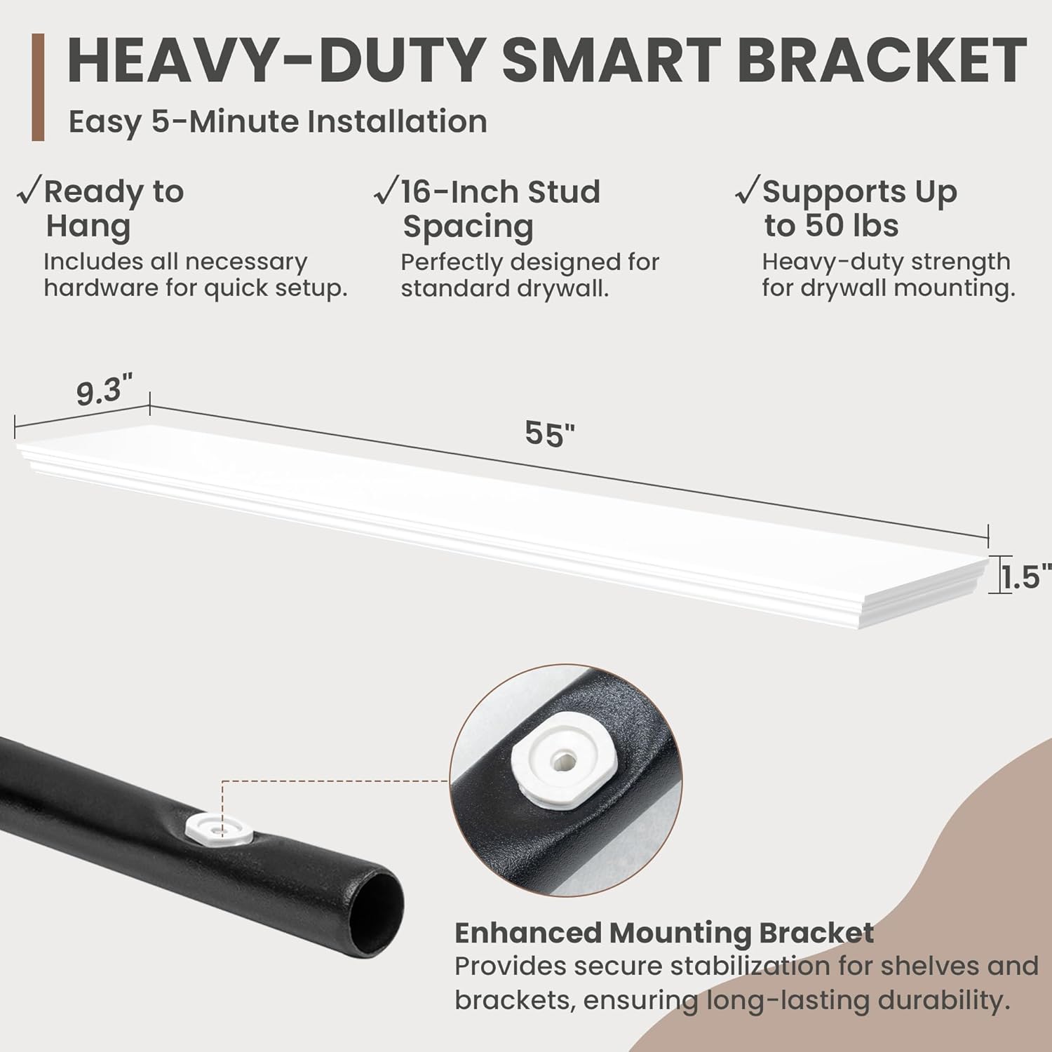 - Package Contents: 1 white floating shelf included, board dimension: 55" Wide x 9.3" Deep x 1.5" Height. Other accessories: 1 metal brackets, 1 magnetic level, 3 wood iron connection screws, 9 wall screws and expansion tubes, and 1 installation manual