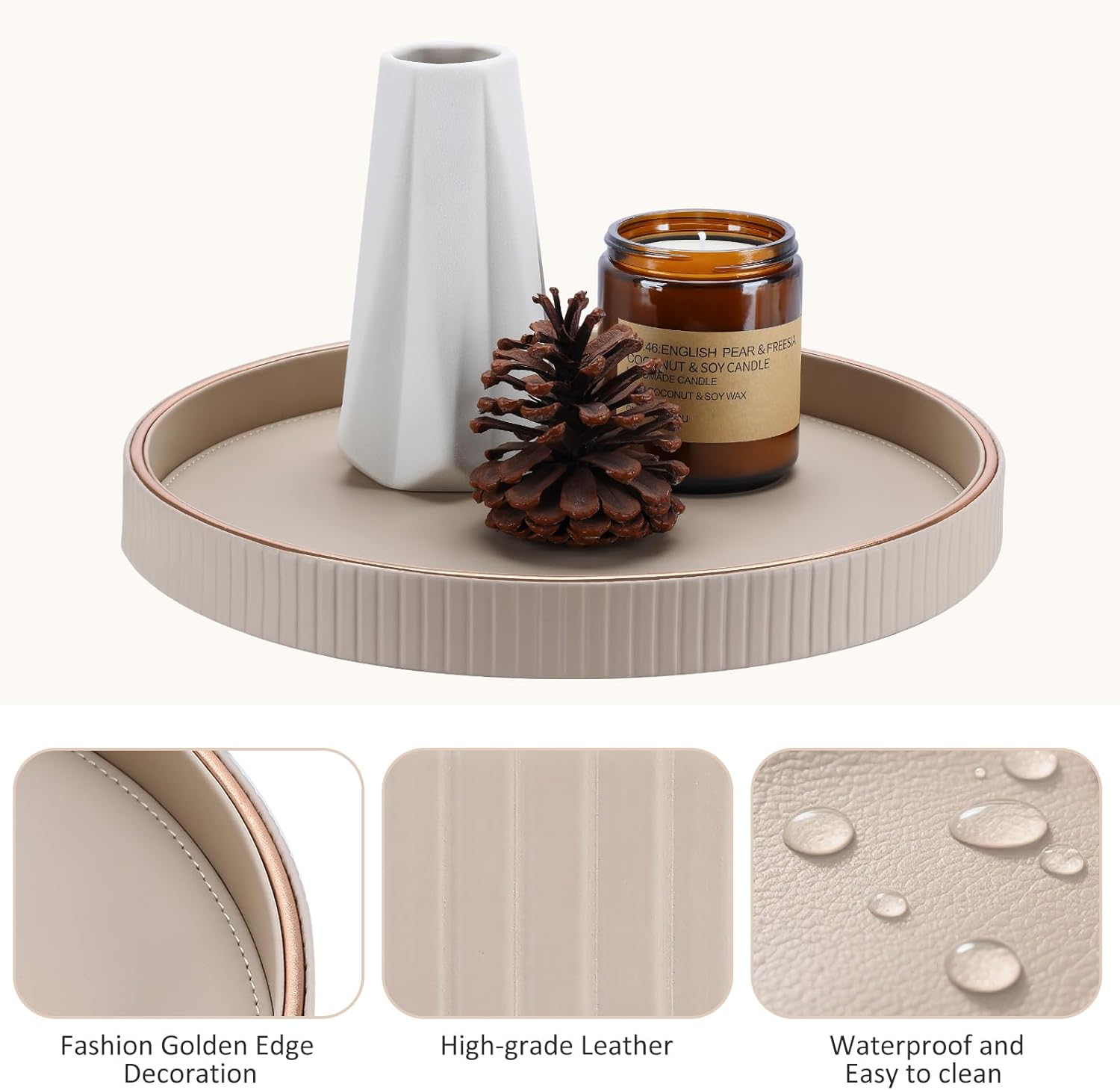 KINGFOM Decorative Serving Tray, PU Leather Valet Nightstand Desk Organizer for Men Women, Round Tray Decor for Coffee Table/Home Decor, Modern Decorative, Centerpiece (Beige)