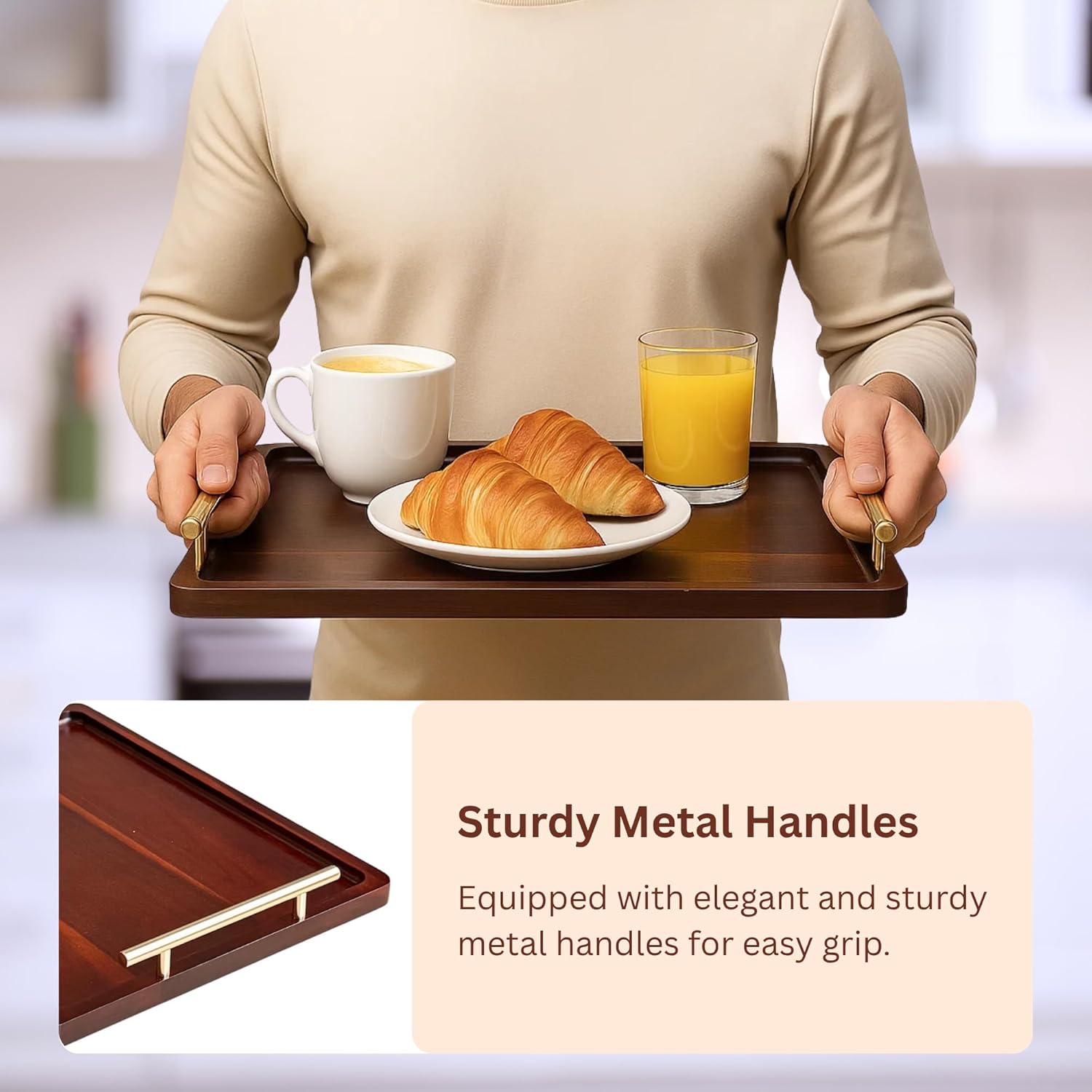 Acacia Wood Serving Tray – 17" x 13" Ottoman Tray with Metal Handles for Coffee Table, Breakfast, Snacks, Tea, Food – Decorative Wooden Tray for Kitchen, Living Room & Bedroom