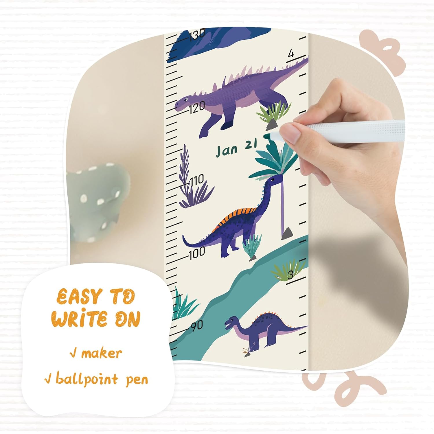 - Design: Kids growth chart with rope at the top of the chart, easy to install and removeable, foldable and portable design, easy to store, hang, roll up, transport, and save space. It boasts a material that's easy to write on, where you can use dark colored ballpoint pens and markers to track growth milestones.