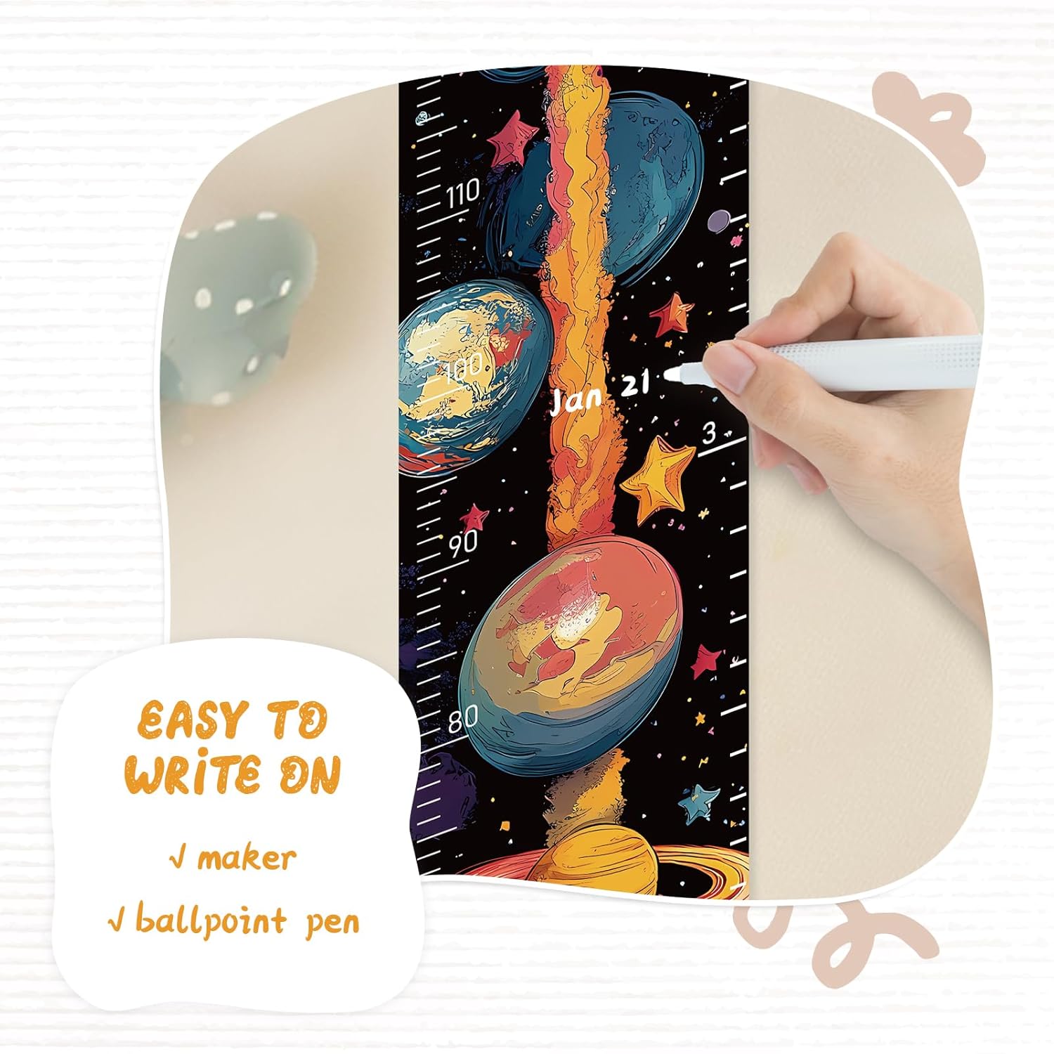 - Design: Kids growth chart with rope at the top of the chart, easy to install and removeable, foldable and portable design, easy to store, hang, roll up, transport, and save space. It boasts a material that's easy to write on, where you can use dark colored ballpoint pens and markers to track growth milestones.